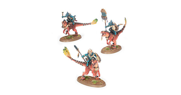 Aggradon Lancers are among the most aggressive cavalry known to the Mortal Realms, for their fearsome scaled steeds only become swifter and more ravenous as battle-frenzy overtakes their senses. A charge of Aggradon Lancers can collapse entire battlelines in a storm of predatory violence, riders and mounts alike lashing out with savage force and overwhelming ferocity.