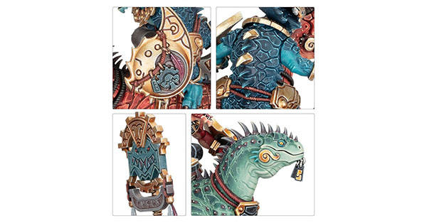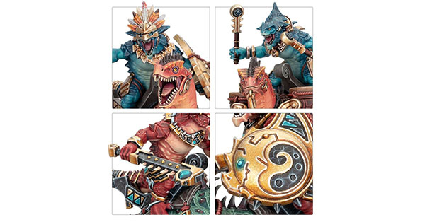 The kit provides a wealth of customisation options – six heads and three shields that can be used with any of the riders, as well as interchangeable tails, armour plates, and feather decorations for the aggradons – allowing you to build a varied roster of reptilian riders and steeds.